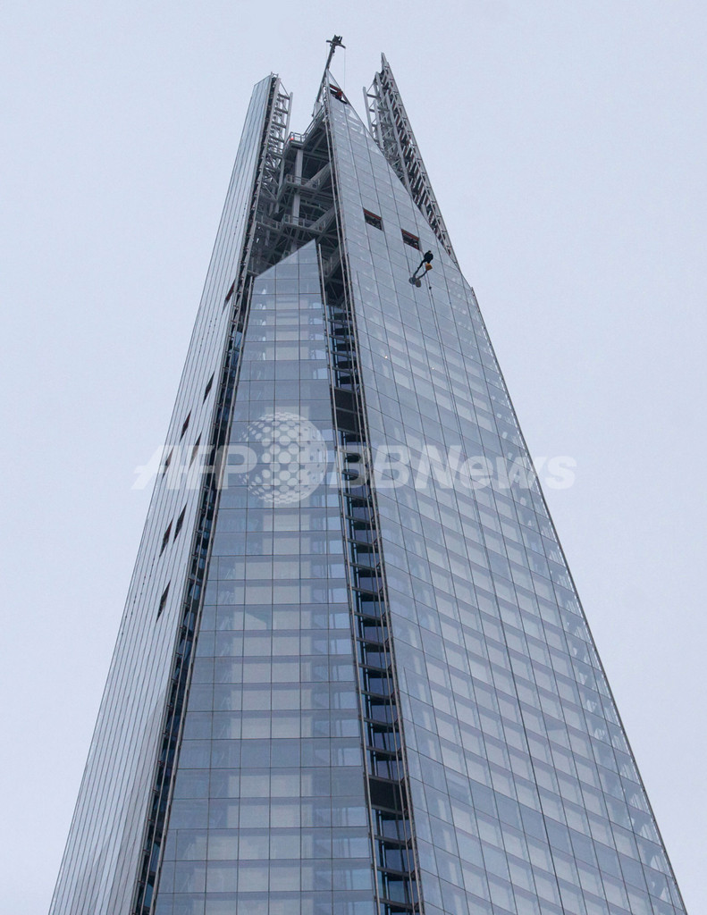 87階から下降を開始し、約30分かけて約235メートル下の20階に到達した。シャードは、前月完成したばかりの欧州一高い高層ビル。(2012年9月3日撮影)。(c)AFP/JOHN STILLWELL