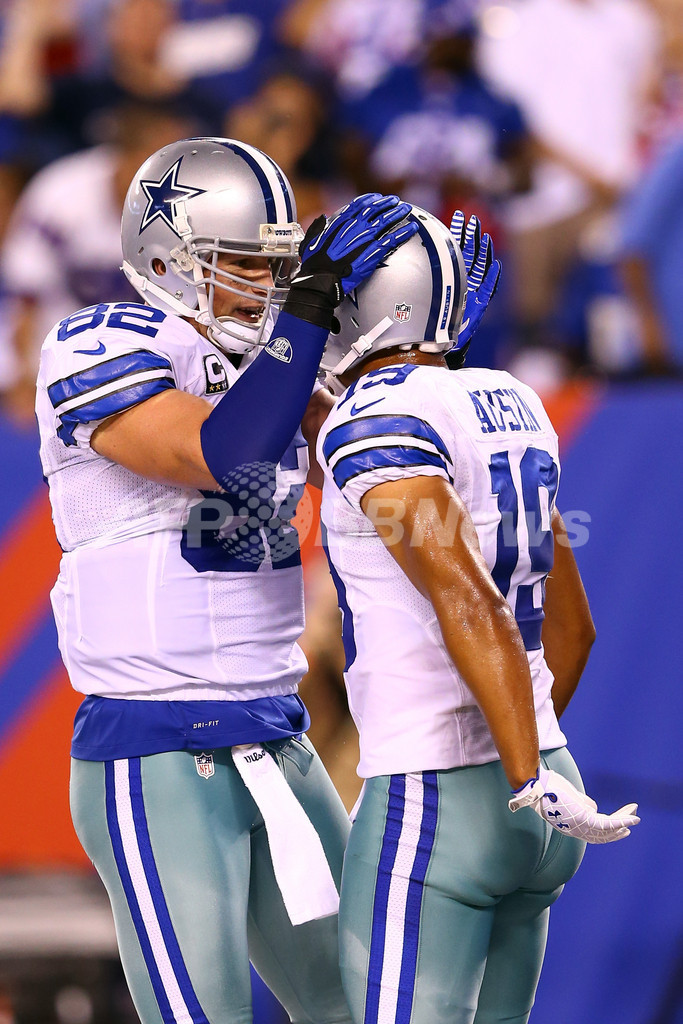 第4クォーターにタッチダウンを決めたマイルズ・オースティン(Miles Austin)を祝福するダラス・カウボーイズのジェイソン・ウィッテン(Jason Witten、2012年9月5日撮影)。(c)AFP/Getty Images/Al Bello
