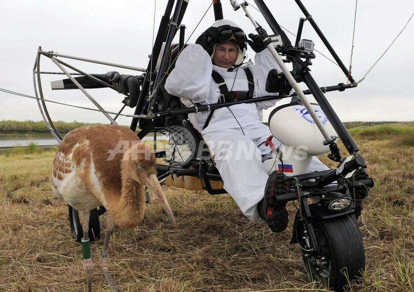 プーチン大統領はソデグロヅルのほかにも、シベリアトラ、ユキヒョウなどロシアの希少動物を保護する姿勢をアピールしてきたが、反プーチン派からは動物の保護よりも写真や映像を通じた自身のイメージアップが目的だと批判されている。(c)AFP