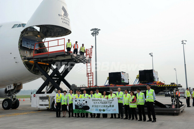 【9月7日 AFP】シンガポールに6日、中国から2頭のジャイアントパンダが到着し、人々の熱い歓迎を受けた。 5歳の雄パンダ「凱凱(カイカイ、Kai Kai)」と4歳の雌パンダ「嘉嘉(ジアジア、Jia Jia)」は、両国の国交樹立20年を記念し、中国から10年間貸与される。検疫期間を経て、シンガポール動物園(Singapore Zoo)に新設された飼育施設で12月から一般公開される予定だ。 貸与期間内での2世誕生に期待をかけるシンガポール政府は、同国の蒸し暑い熱帯気候の中でも2頭が繁殖をしやすいよう、気温などを調節できる飼育施設を数百万ドル(数億円)を掛けて新設した。 シンガポールは、1994年に中国が開始した貸与制度でパンダを借り受けた9番目の国となる。アジア太平洋諸国ではタイ、日本、オーストラリアに次いで4番目。香港など他の場所には別の制度を通じて貸与されている。(c)AFP/Philip Lim