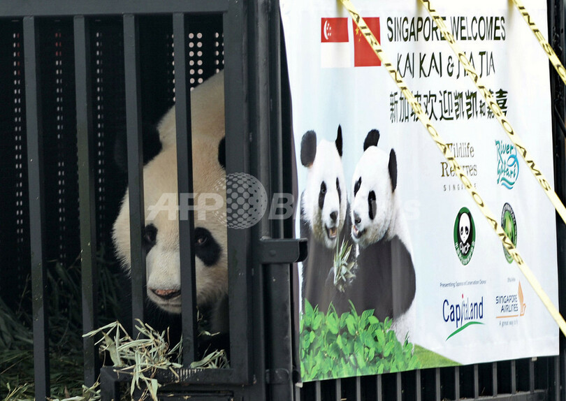 【9月7日 AFP】シンガポールに6日、中国から2頭のジャイアントパンダが到着し、人々の熱い歓迎を受けた。 5歳の雄パンダ「凱凱(カイカイ、Kai Kai)」と4歳の雌パンダ「嘉嘉(ジアジア、Jia Jia)」は、両国の国交樹立20年を記念し、中国から10年間貸与される。検疫期間を経て、シンガポール動物園(Singapore Zoo)に新設された飼育施設で12月から一般公開される予定だ。 貸与期間内での2世誕生に期待をかけるシンガポール政府は、同国の蒸し暑い熱帯気候の中でも2頭が繁殖をしやすいよう、気温などを調節できる飼育施設を数百万ドル(数億円)を掛けて新設した。 シンガポールは、1994年に中国が開始した貸与制度でパンダを借り受けた9番目の国となる。アジア太平洋諸国ではタイ、日本、オーストラリアに次いで4番目。香港など他の場所には別の制度を通じて貸与されている。(c)AFP/Philip Lim