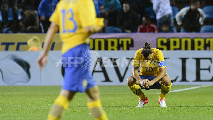ピッチにしゃがみこむスウェーデンのズラタン・イブラヒモビッチ(Zlatan Ibrahimovic、2012年9月6日撮影)。(c)AFP/JONATHAN NACKSTRAND