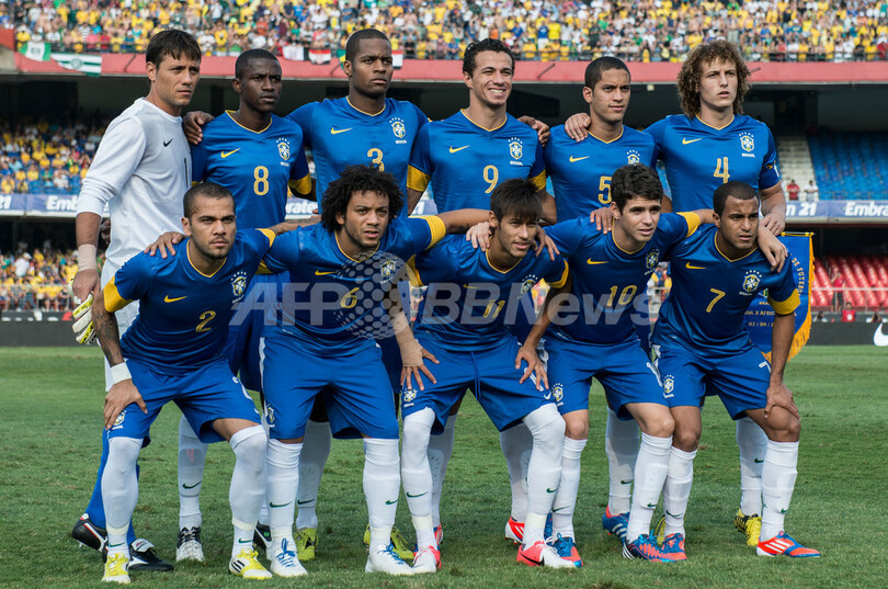 試合開始前の写真撮影に臨むブラジルの選手(2012年9月7日撮影)。(c)AFP/Yasuyoshi CHIBA