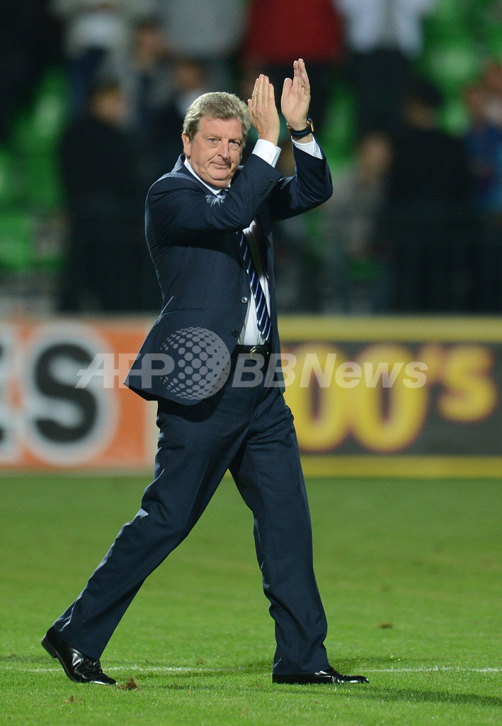 試合後、歓声に応えるイングランドのロイ・ホジソン(Roy Hodgson)監督(2012年9月7日撮影)。(c)AFP/DANIEL MIHAILESCU