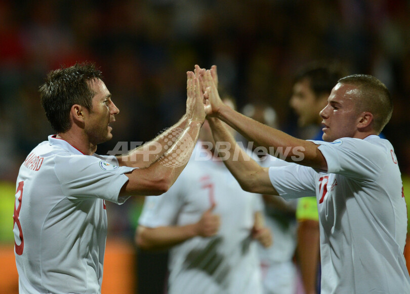得点を挙げ、トム・クレヴァリー(Tom Cleverley、右)と喜ぶイングランドのフランク・ランパード(Frank Lampard、2012年9月7日撮影)。(c)AFP/DANIEL MIHAILESCU