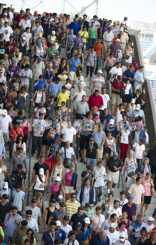 試合の順延が決まり、会場のアーサー・アッシュ・スタジアム(Arthur Ashe stadium)を後にするファン(2012年9月8日撮影)。(c)AFP/DON EMMERT