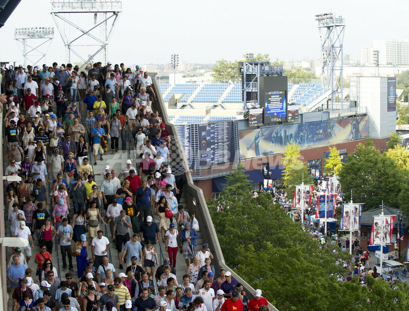 試合の順延が決まり、会場のアーサー・アッシュ・スタジアム(Arthur Ashe stadium)を後にするファン(2012年9月8日撮影)。(c)AFP/DON EMMERT