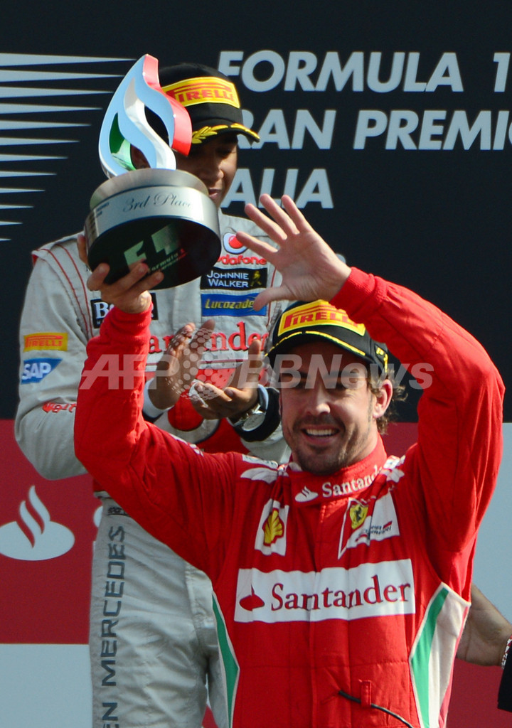 一方、2011年の総合王者でレッドブル(Red Bull)のセバスチャン・ベッテル(Sebastian Vettel)は、レース中にアロンソをトラックの外に押し出したとしてドライブスルーのペナルティーを受け、さらにはマシンの技術的なトラブルに見舞われリタイアに終わるなど散々な結果になった。(c)AFP
