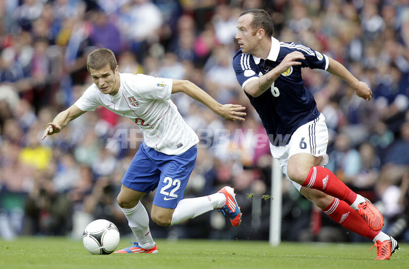 スコットランドのチャーリー・アダム(Charlie Adam、右)のタックルを受けるセルビアのダルコ・ラゾビッチ(Darko Lazovic、左、2012年9月9日撮影)。(c)AFP/GRAHAM STUART