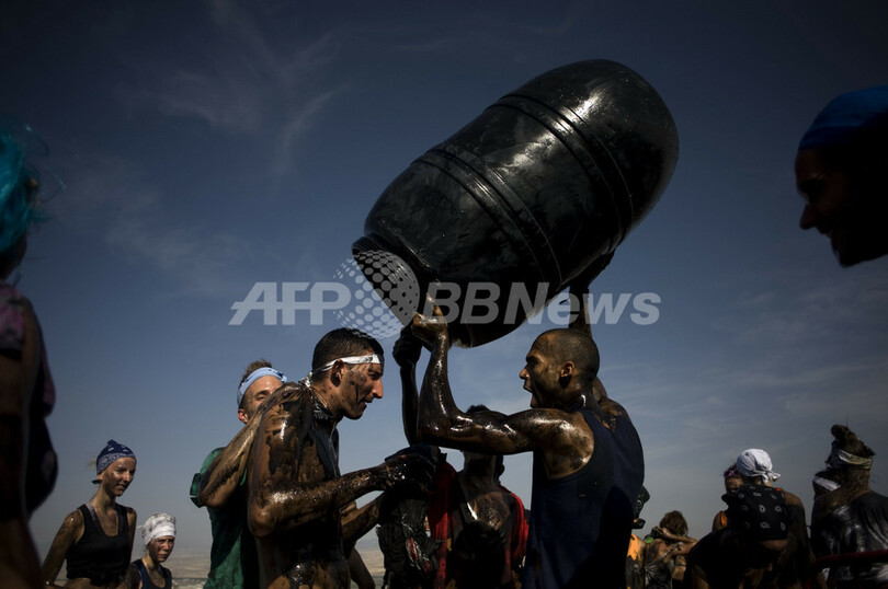写真は、仲間に黒いにグリースをかける男性たち(2012年9月6日撮影)。(c)AFP/JORGE GUERRERO