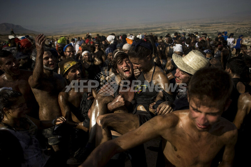 写真は、全身にグリースを塗って祭りに参加する人々(2012年9月6日撮影)。(c)AFP/JORGE GUERRERO
