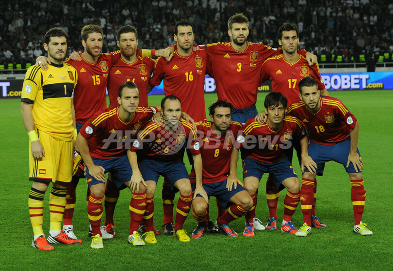 試合前の写真撮影に臨むスペインの選手(2012年9月11日撮影)。(c)AFP/VANO SHLAMOV