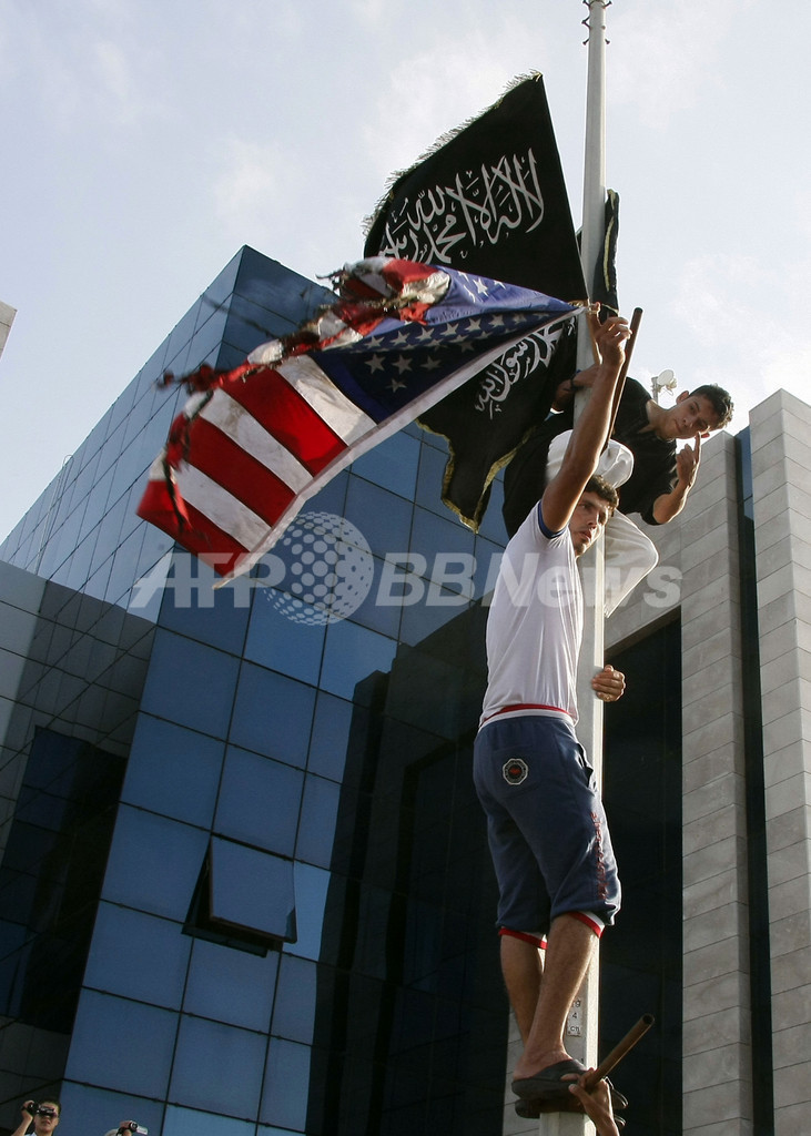 写真は、大使館前に掲げられていた米国旗を燃やし、サラフィストの旗に置き換えるデモ隊(2012年9月12日撮影)。(c)AFP/KHALIL