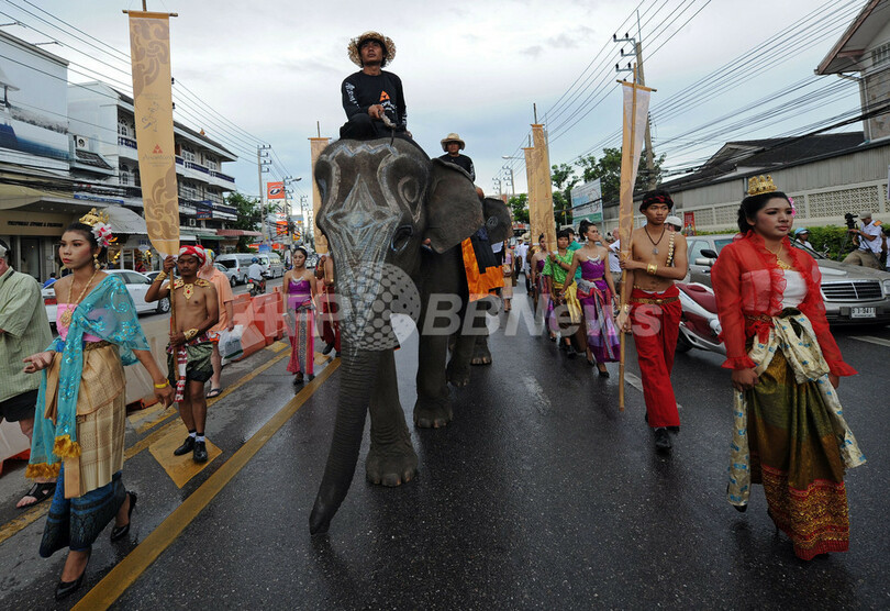 写真は大会の一環で行われた、伝統衣装姿の人々とゾウのパレード(2012年9月12日撮影)。(c)AFP/PORNCHAI KITTIWONGSAKUL