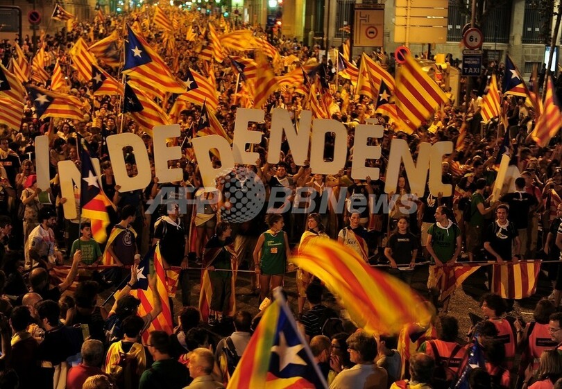 独自の言語と文化を持つスペイン北東部のカタルーニャ自治州。経済規模はポルトガルよりも大きく、スペイン全体の5分の1を占める。しかし中央政府から搾取されているという長年の不満が、現在4人に1人が失業状態という同国全体の経済危機とそれを受けた緊縮財政に対する反発で、いつになく煽られている。バルセロナでのデモには100万人を超える住民が参加。スペインからの「独立と自由」を求めた。