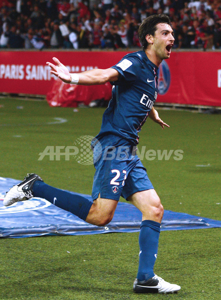 前半38分に先制点を挙げて歓喜するパリ・サンジェルマンのハビエル・パストレ(Javier Pastore、2012年9月14日撮影)。(c)AFP/MIGUEL MEDINA