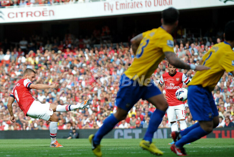 前半31分にチームの2得点目を決めるアーセナルのルーカス・ポドルスキー(Lukas Podolski、2012年9月15日撮影)。(c)AFP/OLLY GREENWOOD