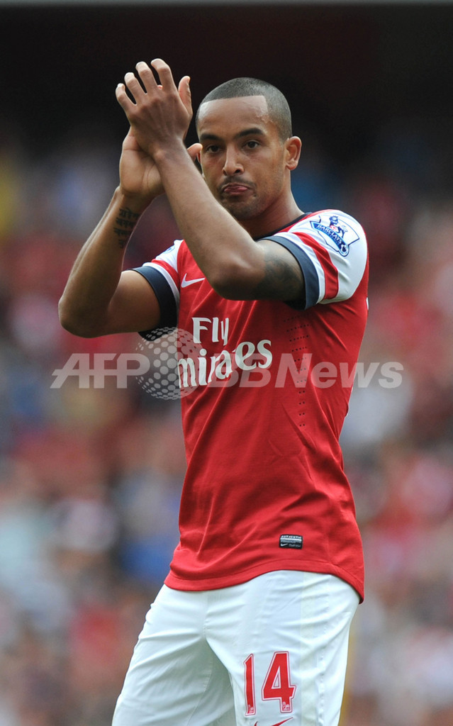 後半43分にチームの6得点目を決め歓喜するアーセナルのテオ・ウォルコット(Theo Walcott、2012年9月15日撮影)。(c)AFP/OLLY GREENWOOD