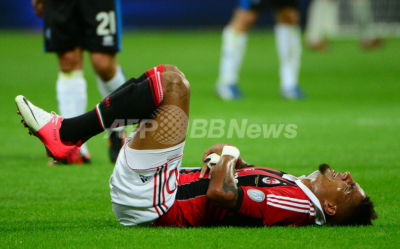 ピッチに倒れ込むACミランのケヴィン・プリンス・ボアテング(Kevin Prince Boateng、2012年9月15日撮影)。(c)AFP/OLIVIER MORIN