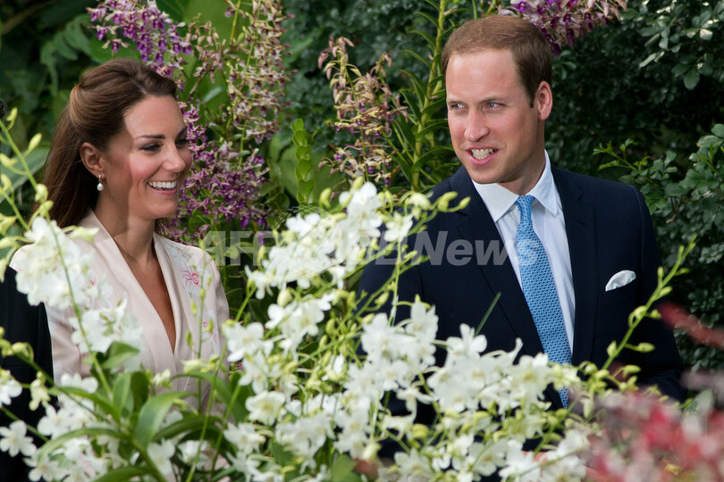 写真は、シンガポールのシンガポール植物園(Singapore Botanical Garden)で、故ダイアナ妃(Princess Diana)の名を冠したランを鑑賞するウィリアム王子とキャサリン妃(2012年9月11日撮影)。(c)AFP/Nicolas ASFOURI