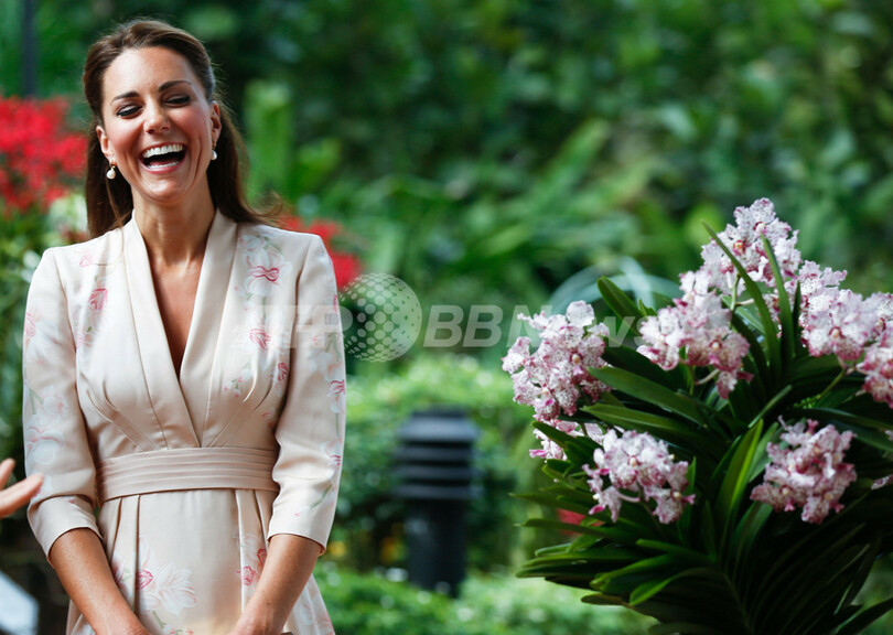 写真は、シンガポールのシンガポール植物園(Singapore Botanical Garden)で、ウィリアム王子と自分の名を冠したランを鑑賞し笑顔を見せるキャサリン妃(2012年9月11日撮影)。(c)AFP/Nicolas ASFOURI