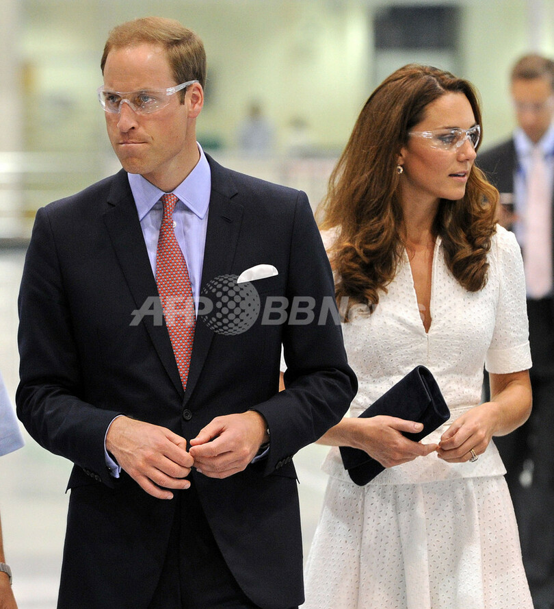 写真は、シンガポールにある英航空機エンジンメーカー、ロールス・ロイス(Rolls-Royce)の工場を視察するウィリアム王子とキャサリン妃(2012年9月12日撮影)。(c)AFP/ROSLAN RAHMAN