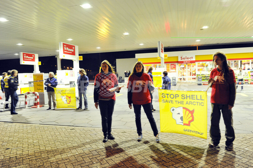 グリーンピースは14日未明、英蘭石油大手ロイヤル・ダッチ・シェル(Royal Dutch Shell)が米アラスカ(Alaska)沖の北極海で石油掘削を開始したことに抗議し、オランダ国内50か所のシェルのガソリンスタンドを占拠した。米地質調査所(US Geological Survey、USGS)によれば北極圏の海底には、地球上の未発見の原油埋蔵量の13%にあたる原油と、同30%に相当する天然ガスが眠っているとされる。(c)AFP
