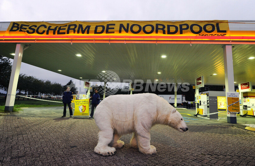 【9月14日 AFP】オランダ中部の町ブリューケレン(Breukelen)で、未明のガソリンスタンドを襲ったホッキョクグマ――ではなく、これは国際環境保護団体「グリーンピース(Greenpeace)」の抗議行動。シロクマは等身大の人形だ。