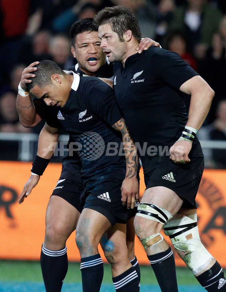 トライを決めてチームメイトのケビン・メアラム(Keven Mealamu、中央)とリッチー・マッコウ(Richie McCaw、右)に祝福されるオールブラックスのアーロン・スミス(Aaron Smith、2012年9月15日撮影)。(c)AFP/Marty Melville