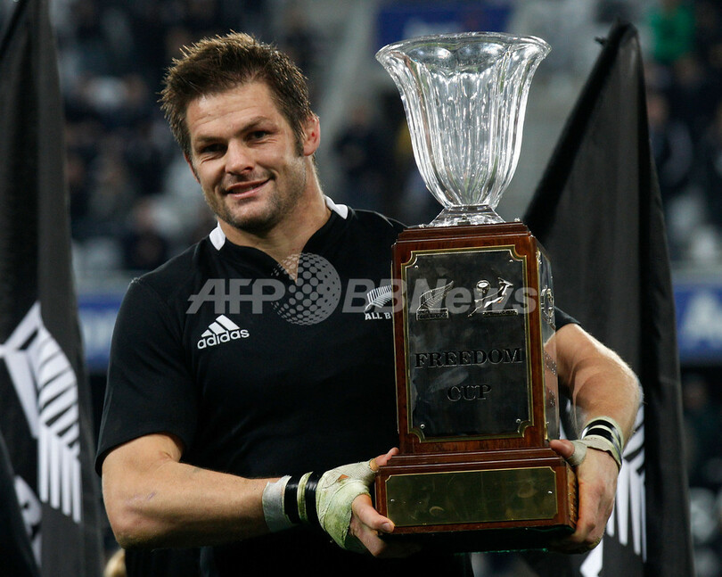 ニュージーランド対南アフリカの勝者に与えられるフリーダムカップ(Freedom cup)を手にポーズを取るオールブラックスのリッチー・マッコウ(Richie McCaw、2012年9月15日撮影)。(c)AFP/Marty Melville