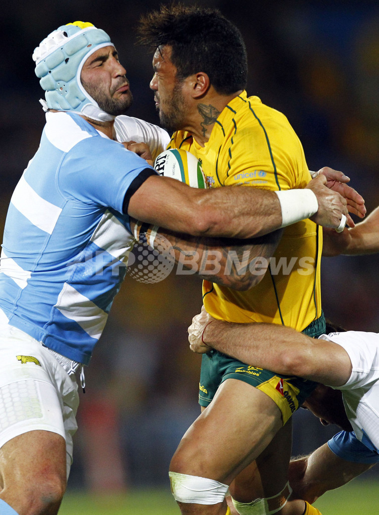 ロス・プーマスのファン・マヌエル・レギサモン(Juan Manuel Leguizamon、左)のタックルを受けるワラビーズのディグビー・イオアネ(Digby Ioane、2012年9月15日撮影)。(c)AFP/Patrick HAMILTON