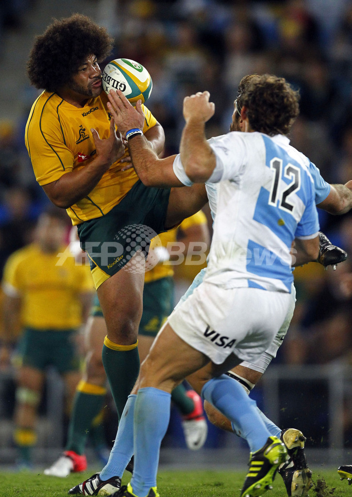 ロス・プーマスのサンチャゴ・フェルナンデス(Santiago Fernandez、右)の前でボールを掴むワラビーズのタタフ・ポロタナウ(Tatafu Polota Nau、2012年9月15日撮影)。(c)AFP/Patrick HAMILTON