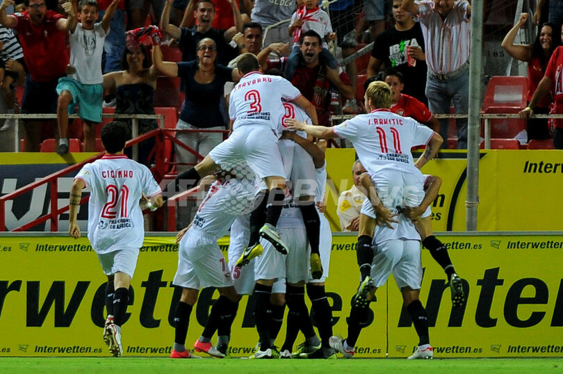 前半2分のペテル・トロショフスキ(Piotr Trochowski)の先制点に歓喜するセビージャFCの選手(2012年9月15日撮影)。(c)AFP/JORGE GUERRERO