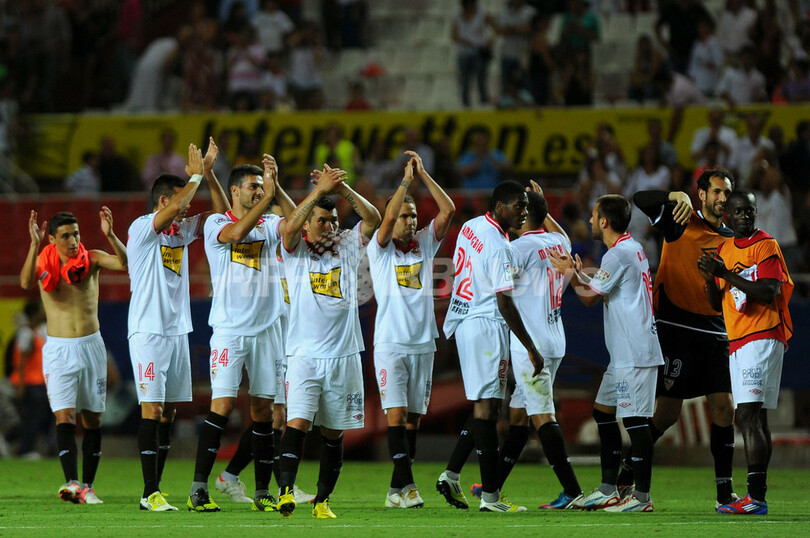 試合に勝利し、サポーターの声援に拍手で応えるセビージャFCの選手(2012年9月15日撮影)。(c)AFP/JORGE GUERRERO