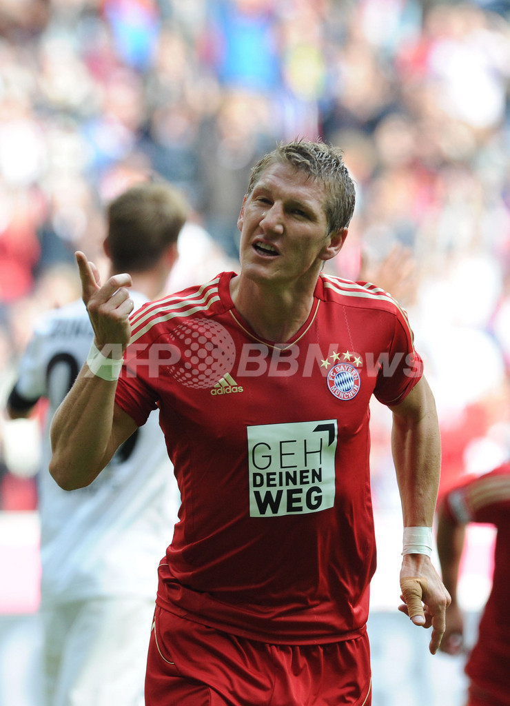 バイエルンは、練習で大腿部を痛めたフランク・リベリ(Franck Ribery)とアリエン・ロッベン(Arjen Robben)を欠きながらも勝利を挙げ、リーグ戦全勝を維持して首位を守った。また新加入のハビエル・マルティネス(Javier Martinez Aginaga)は、交代出場で15分ほどのプレーにとどまっている。(c)AFP/Ryland James