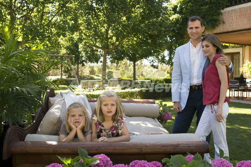 写真は、マドリード(Madrid)の公邸でポーズをとるフェリペ皇太子(Crown Prince Felipe、右から2人目)、レティシア皇太子妃(右)、娘のソフィア王女(左)とレオノール王女(中央、2012年8月1日撮影、9月15日提供)。(c)AFP/HO/CASA REAL/Cristina Garcia Rodero