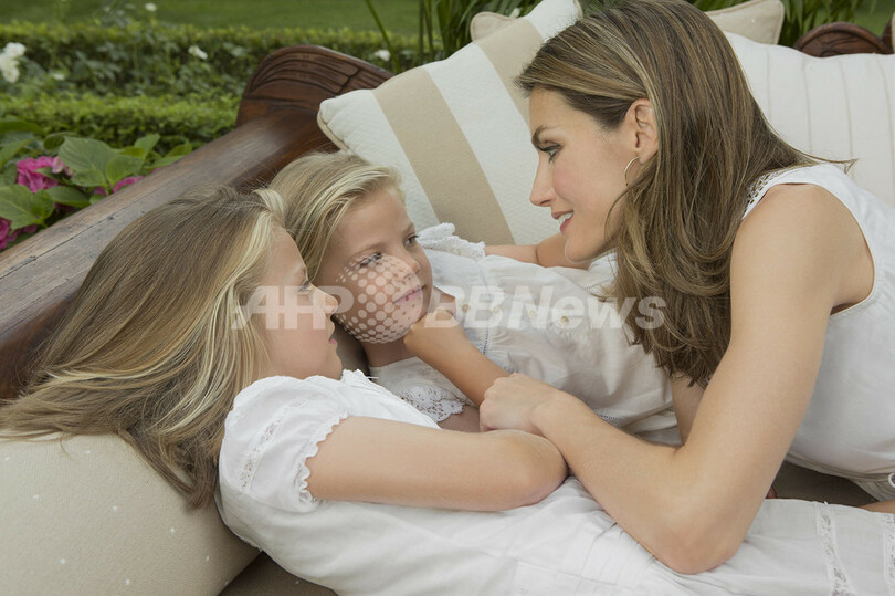 写真は、マドリード(Madrid)の公邸で写真撮影に応じるレティシア皇太子妃(右)、娘のソフィア王女(中央)とレオノール王女(左、2012年8月1日撮影、9月15日提供)。(c)AFP/HO/CASA REAL/Cristina Garcia Rodero