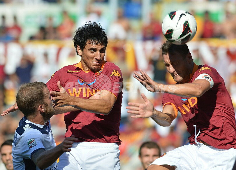 ボールをヘディングするASローマのフランチェスコ・トッティ(Francesco Totti、2012年9月16日撮影)。(c)AFP/ALBERTO PIZZOLI