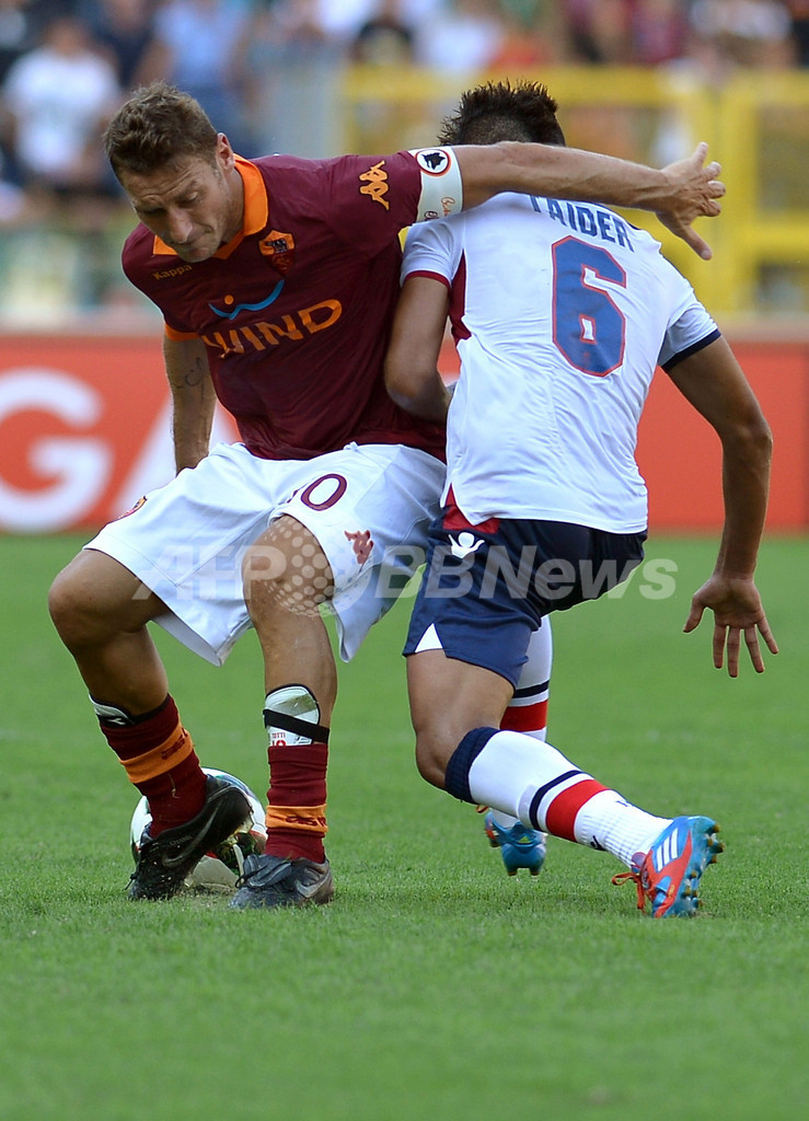 ボローニャの選手とボールを競るASローマのフランチェスコ・トッティ(Francesco Totti、2012年9月16日撮影)。(c)AFP/ALBERTO PIZZOLI
