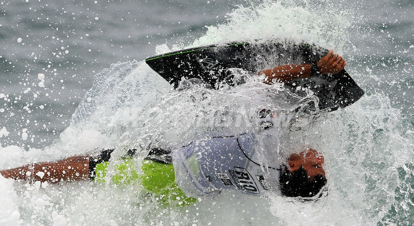 ボディーボードは、ボードに腹ばいになり波に乗る競技(2012年9月14日撮影)。(c)AFP/ANTONIO SCORZA