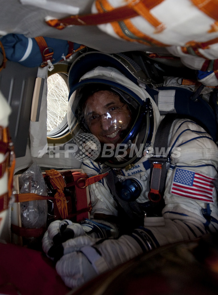 写真はソユーズ着陸直後に宇宙船内部に座るアカバ飛行士(2012年9月17日撮影)。(c)AFP/SHAMIL ZHUMATOV