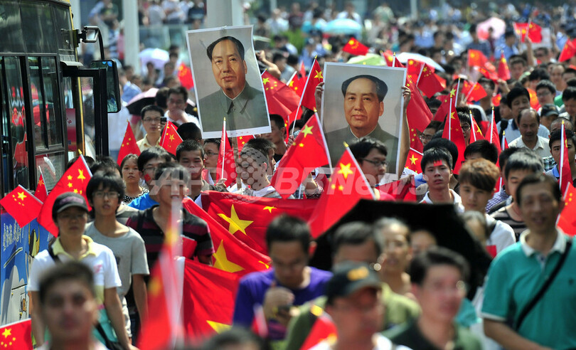 写真は、湖北(Hubei)省武漢(Wuhan)で国旗と故毛沢東(Mao Zedong)主席の肖像画を掲げて行進するデモ参加者(2012年9月16日撮影)。(c)AFP