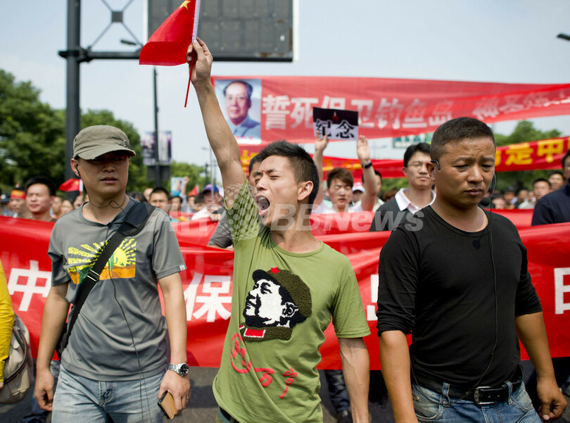 北京(Beijing)の日本大使館前には18日、数千人のデモ隊が集結した。一部が卵やペットボトルを投げ付けたほか、故毛沢東(Mao Zedong)主席の肖像画を掲げる集団も見られた。ある工場労働者(31)は「中国はもはや弱い国ではない。われわれは強い。これ以上日本にいじめられることはない」「釣魚島は中国領土であり、日本から守らなければならない」と訴えた。