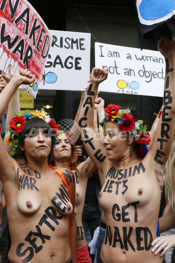 【9月19日 AFP】パリ(Paris)で18日、ウクライナの女性権利団体「FEMEN」がFEMENセンター(Femen Centre)のオープンに合わせ、トップレスで「反女性政治」に対する抗議を行った。(c)AFP