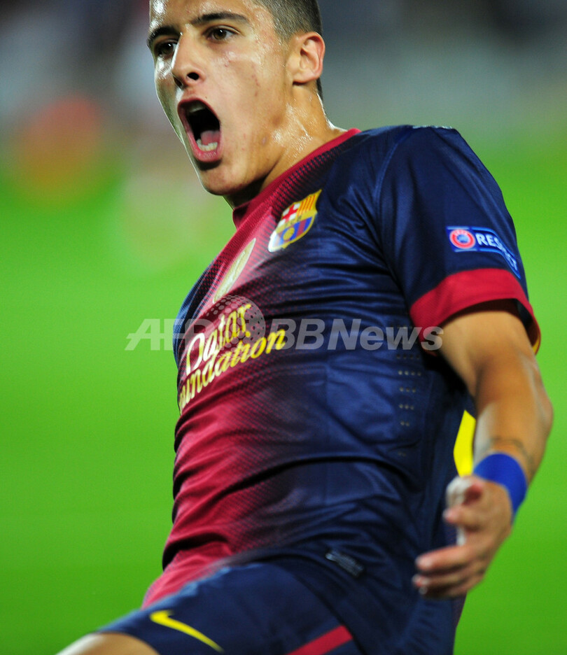 前半14分に先制点を挙げて歓喜するFCバルセロナのクリスティアン・テージョ(Christian Tello、2012年9月19日撮影)。(c)AFP/LLUIS GENE