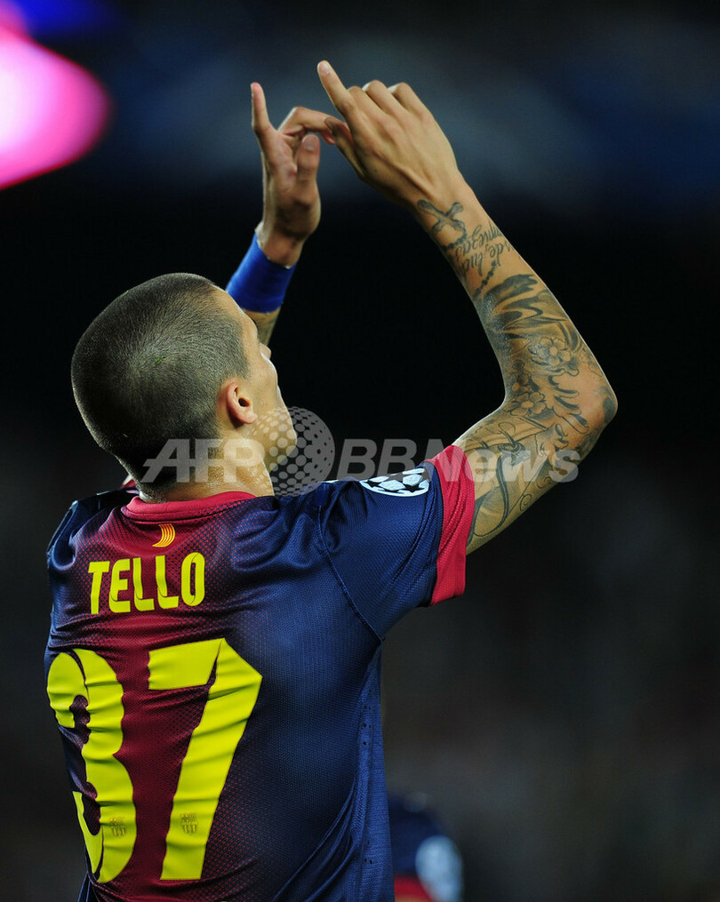 前半14分に先制点を挙げて歓喜するFCバルセロナのクリスティアン・テージョ(Christian Tello、2012年9月19日撮影)。(c)AFP/LLUIS GENE
