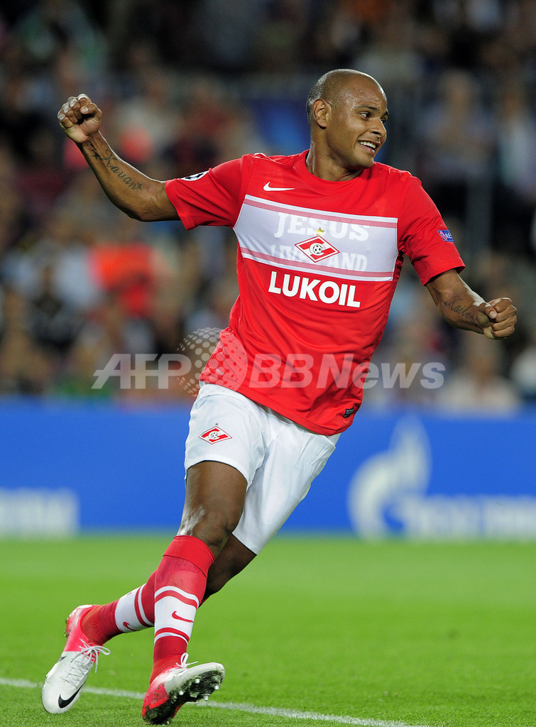 前半29分にFCバルセロナのダニエル・アルヴェス(Daniel Alves)のオウンゴールで同点に追いつき、喜ぶスパルタク・モスクワのアリ(Ariclenes da Silva Ferreira aka ''Ari''、2012年9月19日撮影)。(c)AFP/JOSEP LAGO