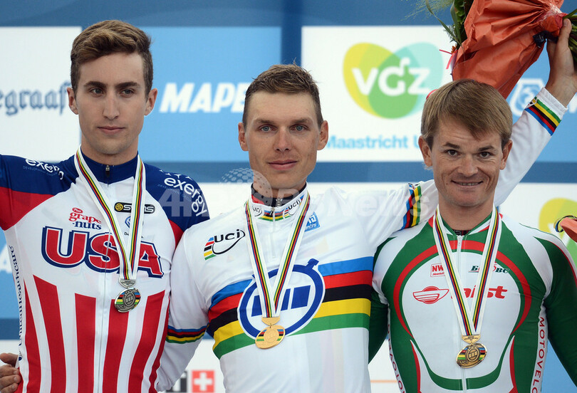 表彰台でポーズを取る(左から)銀メダルのテイラー・フィニー(Taylor Phinney、米国)、金メダルのトニー・マルティン、銅メダルのヴァシリ・キリエンカ(Vasil Kiryienka、ベラルーシ、2012年9月19日撮影)。(c)AFP/FRANCK FIFE