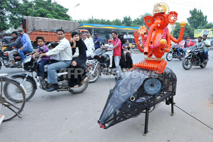 【9月20日 AFP】インド・ハイデラバード(Hyderabad)の街中を18日、巨大ネズミの上に乗ったヒンズー教の神ガネーシャ(Ganesh)のロボットが練り歩いた。