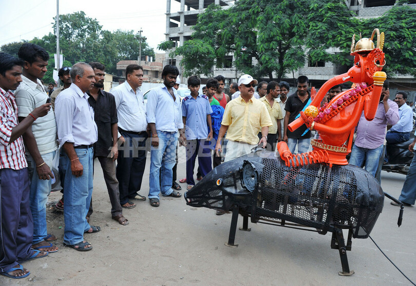 【9月20日 AFP】インド・ハイデラバード(Hyderabad)の街中を18日、巨大ネズミの上に乗ったヒンズー教の神ガネーシャ(Ganesh)のロボットが練り歩いた。
